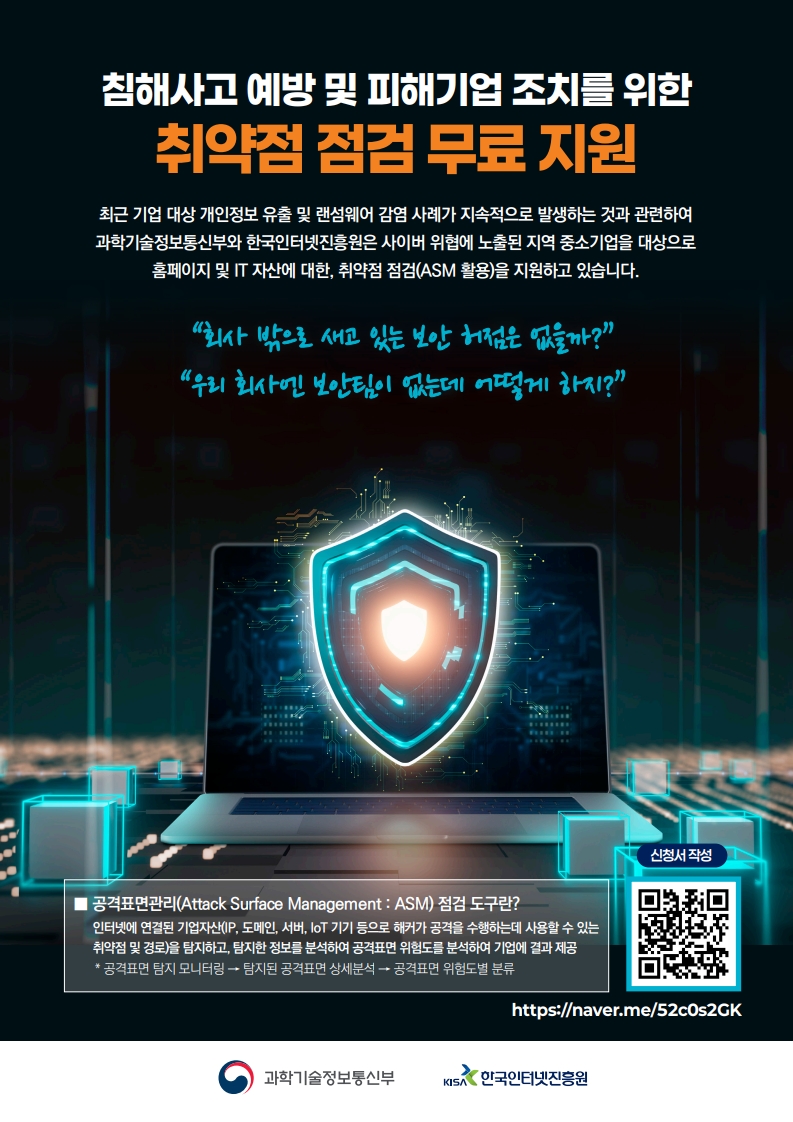최근 기업 대상 개인정보 유출 및 랜섬웨어 감염 사례가 지속적으로 발생하는 것과 관련하여 과학기술정보통신부와 한국인터넷진흥원은 사이버 위협에 노출된 지역 중소기업을 대상으로 홈페이지 및 IT 자산에 대한, 취약점 점검(ASM 활용) 을 지원하고 있습니다.