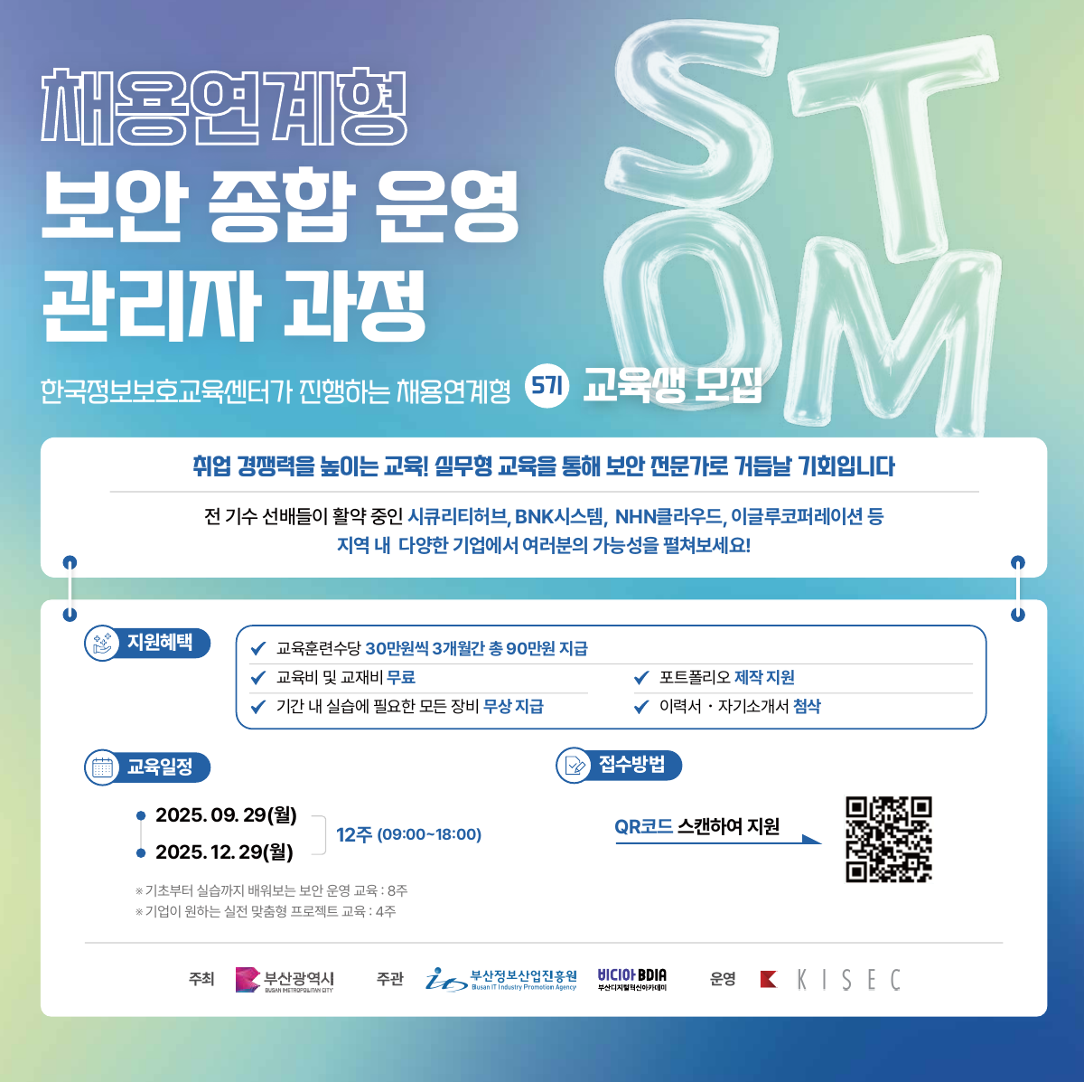 이번 교육은 상반기에 뛰어난 성과로 마무리된 보안 종합 운영 관리자 과정입니다! 상반기 교육을 놓쳐 아쉬웠던 분들, 이제 하반기 기회가 찾아왔습니다! 보안의 A부터 Z까지, 실무 중심 교육으로 여러분을 보안 전문가로 만들어 드립니다. 📈 3년째 이어지는 부산지사 채용연계 + 전 기수 화려한 취업 성과 🚀 보안 전문가로 가는 지름길, 바로 여기! 망설이다가 기회를 놓치지 말고, 이번엔 꼭 잡아서 취업 성공 스토리의 주인공이 되어보세요! 👇 접수 링크 👇 - https://forms.gle/Gtpxdj8jtTrcAztS8 ✨지원혜택✨