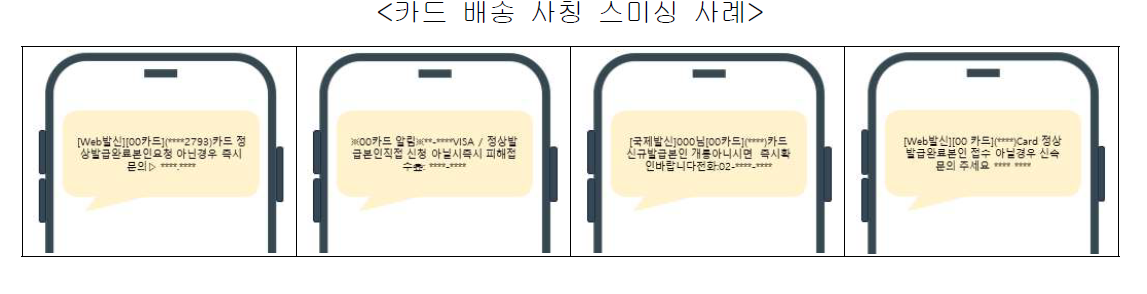 o 최근 “카드 배송”, “카드 발급” 등 카드 배송을 사칭해 전화를 유도 한 뒤, 원격제어 앱 설치 등을 요구하는 보이스피싱·스미싱 사례가 탐지됨에 따라 개인정보 탈취 및 금전적 피해로 연계되지 않도록 사용자 주의 필요